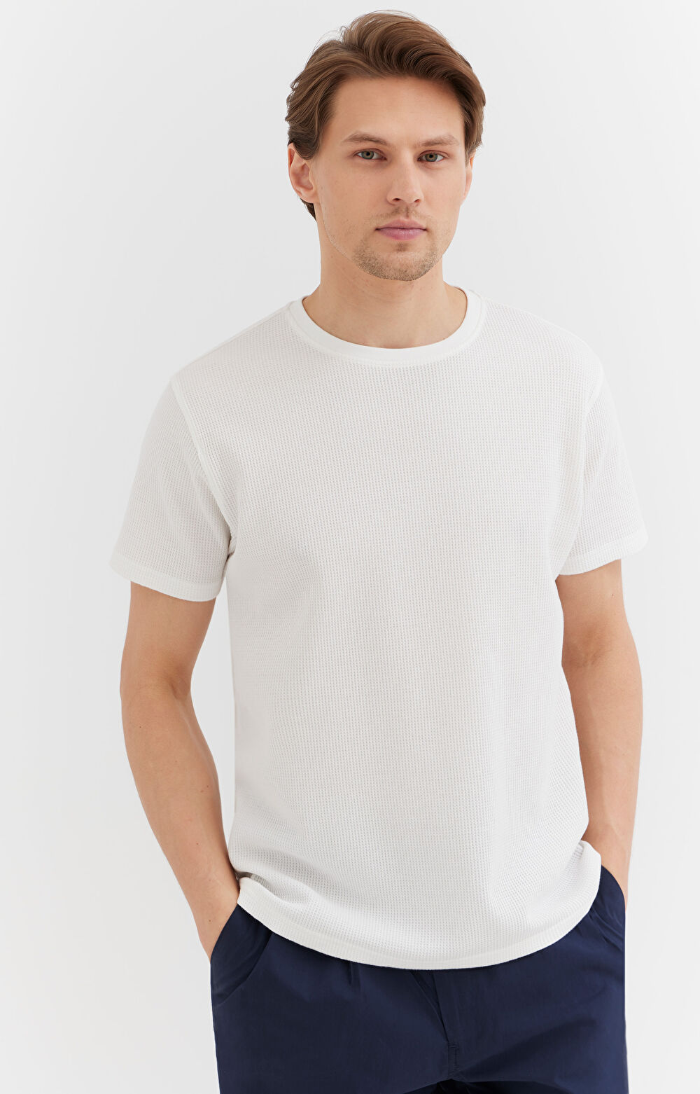 T-shirt męski o prostym fasonie. Uszyty ze strukturalnej dzianiny.